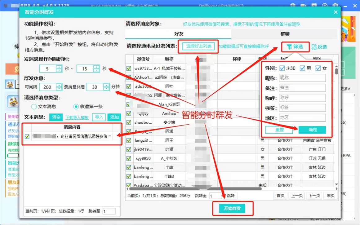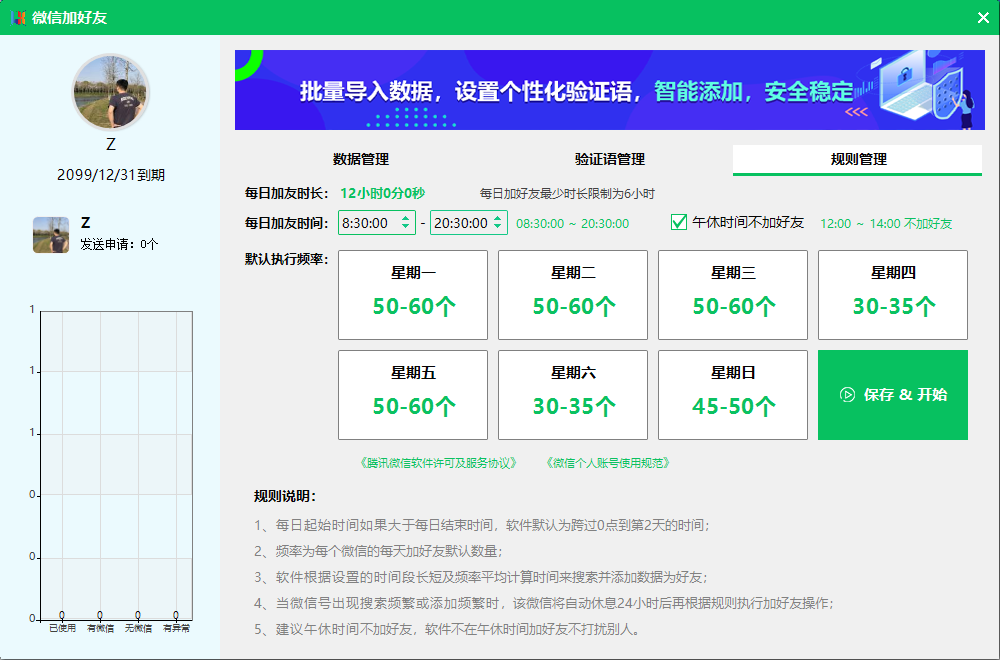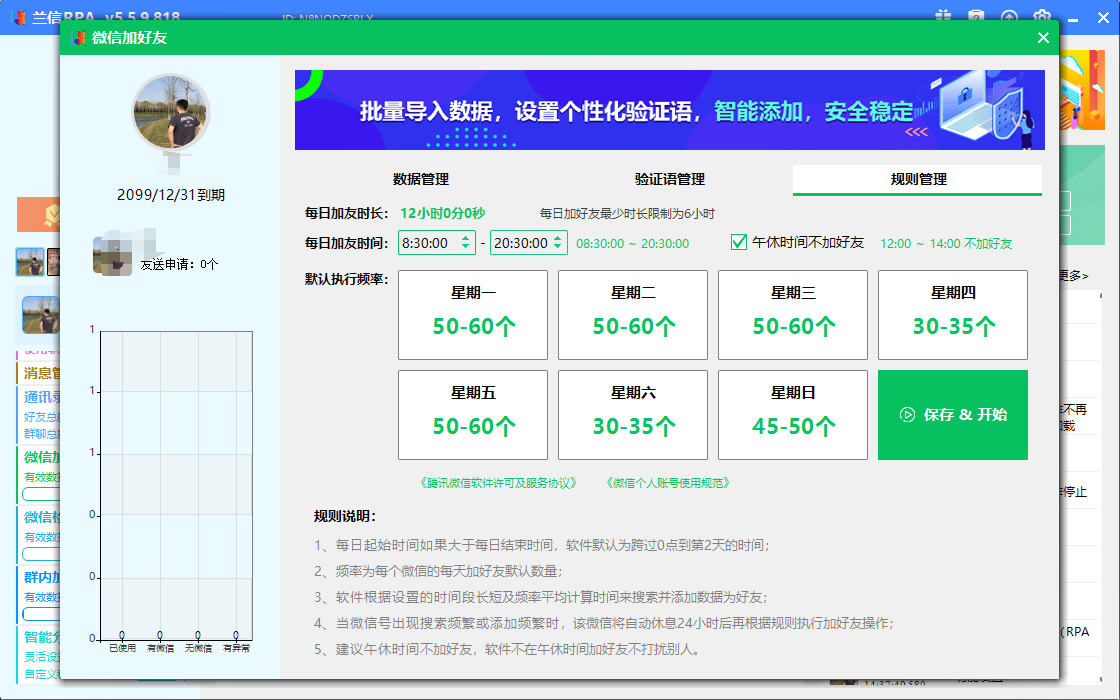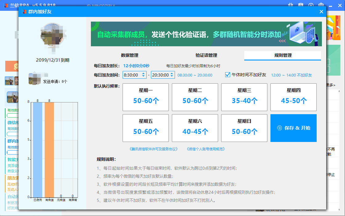 兰信RPA自动化微信加好友系统,物理点击模拟人工,真正的稳定不封 号的软件,通过导入精准的手机号微信号表格实现精准稳定长久获客。 支持同时登录五个微信进行添加,支持设置单个微信号不通时间段随机 添加次数。支持小铃铛提示加人倒计时,支持自定义招呼语自动备注名 字和标签,支持拓展新好友自动回复,关键词回复,智能分时发消息。# 私域#获客 全网独家群内自动加好友上线自动采集群成员,发送个性化验证语,多 群随机智能分时添加支持多个微信群随机添加可以勾选多个微信群自动检测群成员昵称是否重复